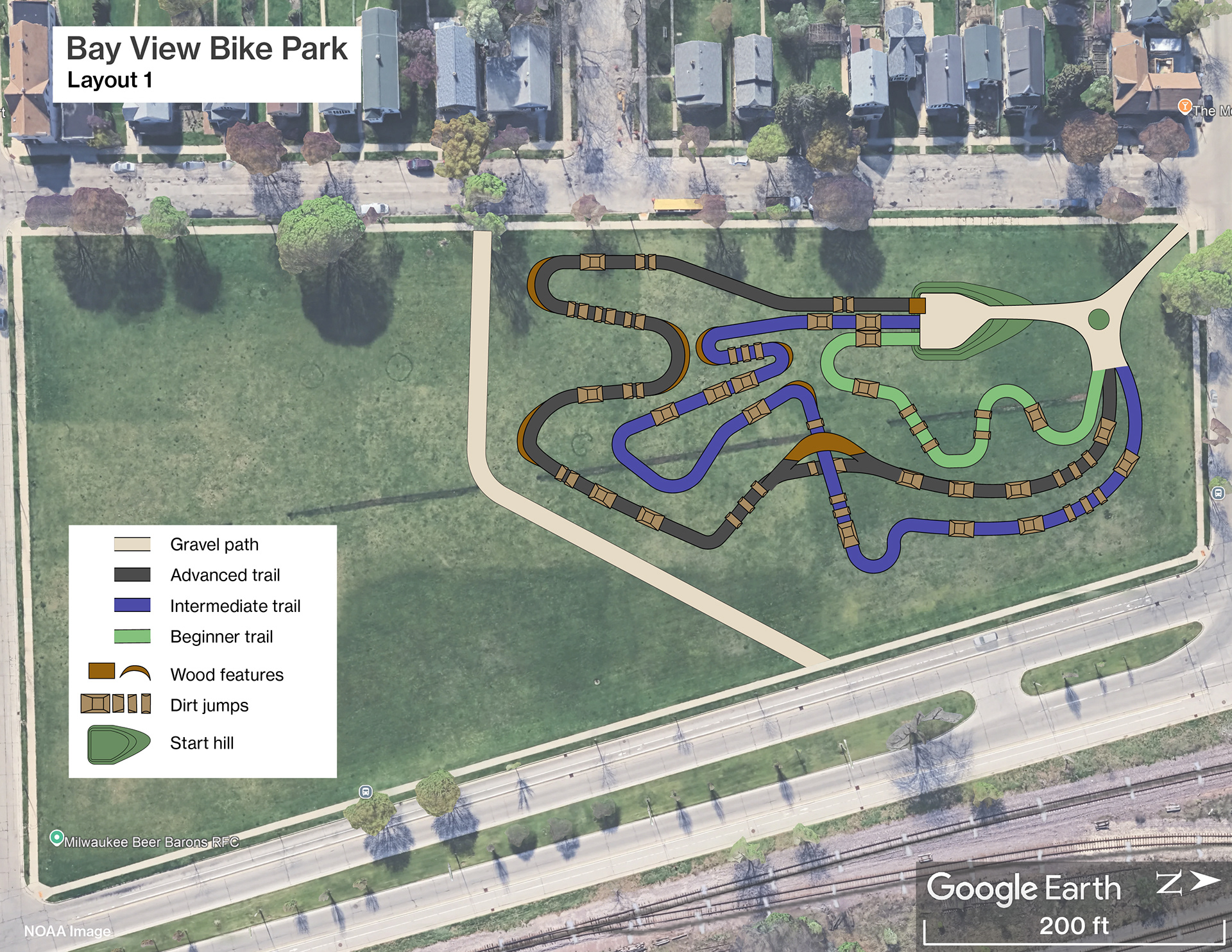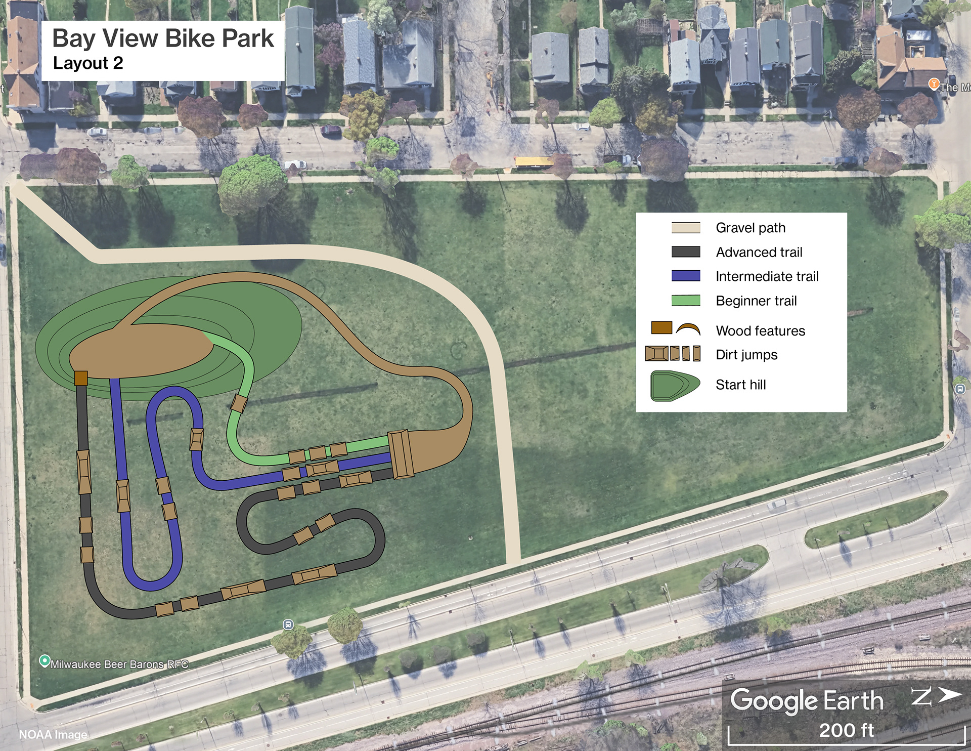 A 5.6-acre parcel sits vacant at 2372 S. Logan Ave. near the heart of Bay View. This property is between Beulah Brinton Park to the south and a dog exercise area to the north. Developing a bike park on this property will provide more opportunity for recreation in the neighborhood and create a unique-to-Milwaukee experience which will attract people to Bay View.