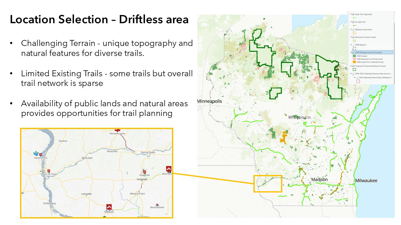 Below is an ArcGIS Story Map and a survey I created to grow public awareness and gather feedback about creating a MTB park in Menomonee Falls, WI. This project is ongoing.
